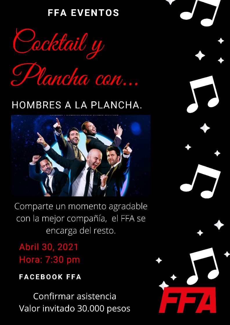 Esta vez los invitamos a compartir un excelente espacio lleno de color, música y buena compañía con nuestro evento virtual “Cocktail y Plancha”, tendremos show de los famosos “Hombres a la Plancha” a través de nuestro Live de Facebook del FFA. Todos cordialmente invitados a pasar una noche diferente el próximo 30 de abril de 2021 a la 7:30 PM, tenemos muchas sorpresas para todos.